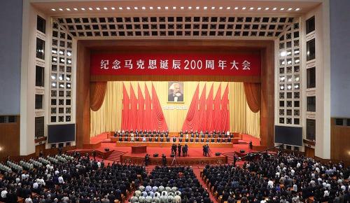 2018年5月4日,纪念马克思诞辰200周年大会在人民大会堂举行。中共中央总书记、国家主席、中央军委主席习近平出席大会并发表重要讲话。